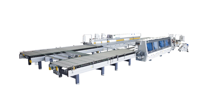 Два автоматических кромкооблицовочных станка объединены с помощью П-образного возвратного конвейера для выполнения двухсторонней обработки за один проход. Подача и выгрузка в одной рабочей зоне.
